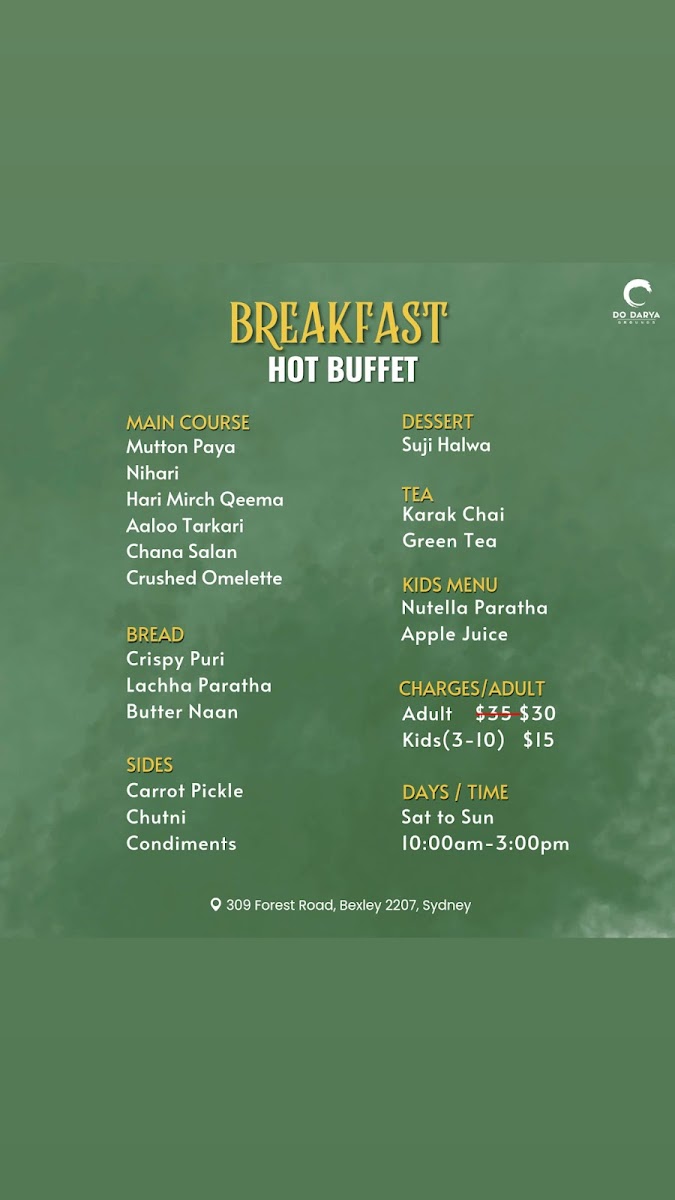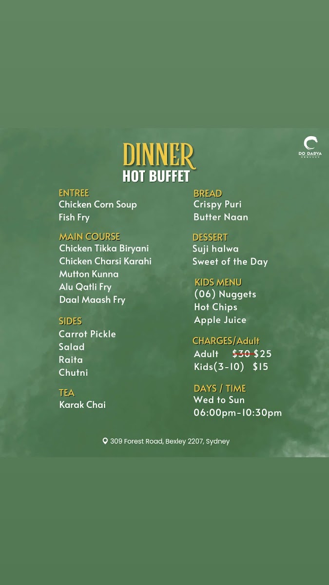 Welcome to Do Darya Grounds, a gem tucked away at 309 Forest Rd, Bexley, NSW, where authentic Pakistani cuisine comes to life. This restaurant boasts a diverse menu that caters to both buffet lovers and those seeking individual meals. For just $25, indulge in a buffet brimming with freshly made dishes, including savory curries and delectable biryani. The atmosphere is lively, enhanced by the option of live music while you dine.